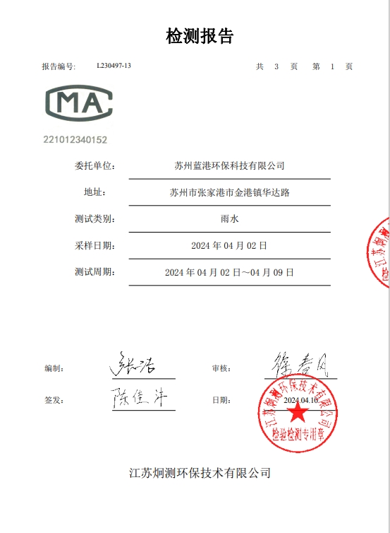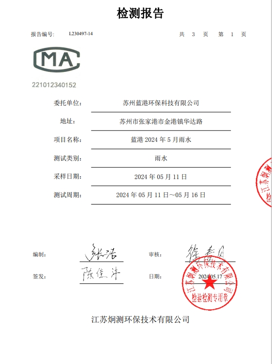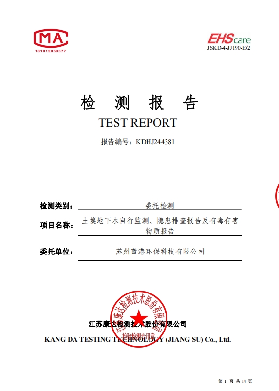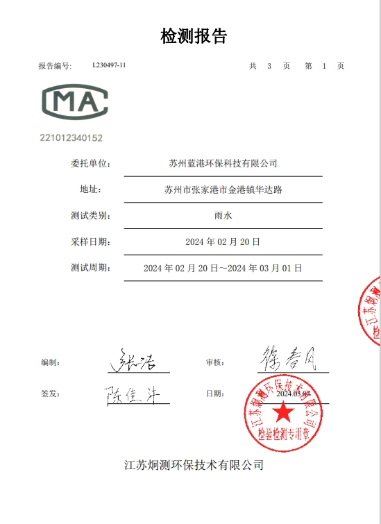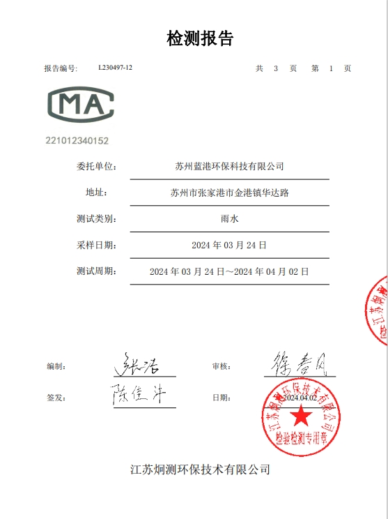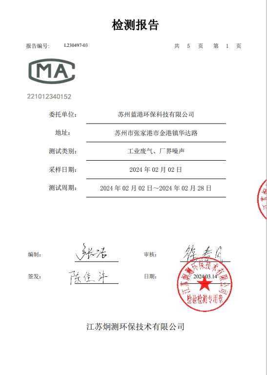 蘇州藍(lán)港環(huán)保科技有限公司檢測報(bào)告已公示,詳情請查...